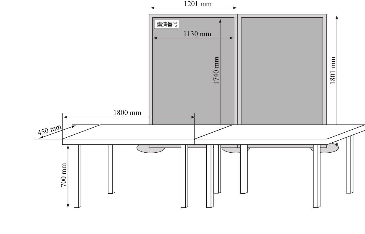1ブースは幅1201mm×高さ1801mmの展示パネル2枚分と幅1800mm、奥行き450mm、高さ700mmの机を2台ご用意いたします。